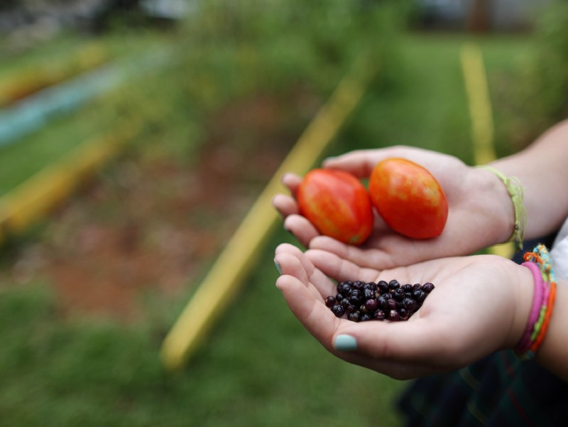| Estudiante de cuarto grado y de décimo grado colaborando en el huerto |